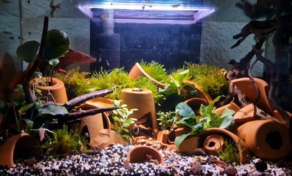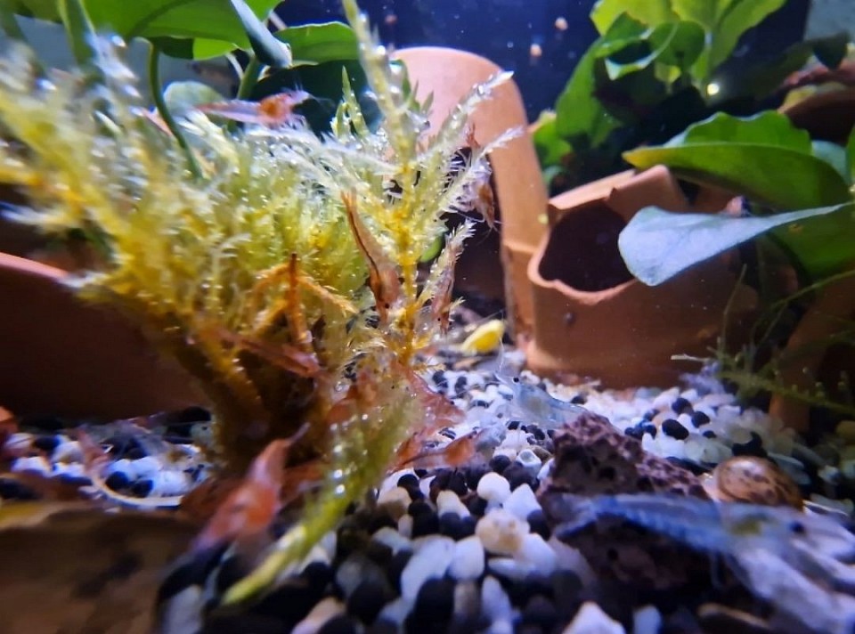 Spießmoos (Vesicularia sp.) ist für Zwerggarnelen ein wahres Paradies: Die feinen, verzweigten Strukturen bieten ideale Verstecke, Schutz beim Häuten und Rückzugsorte für Jungtiere. Gleichzeitig sammeln sich darin Mikroorganismen und Biofilm – eine natürliche Nahrungsquelle, die Garnelen begeistert abweiden. Das Moos schafft also nicht nur ein ästhetisches, sondern auch ein funktionales Biotop, das das Wohlbefinden der Tiere sichtbar steigert